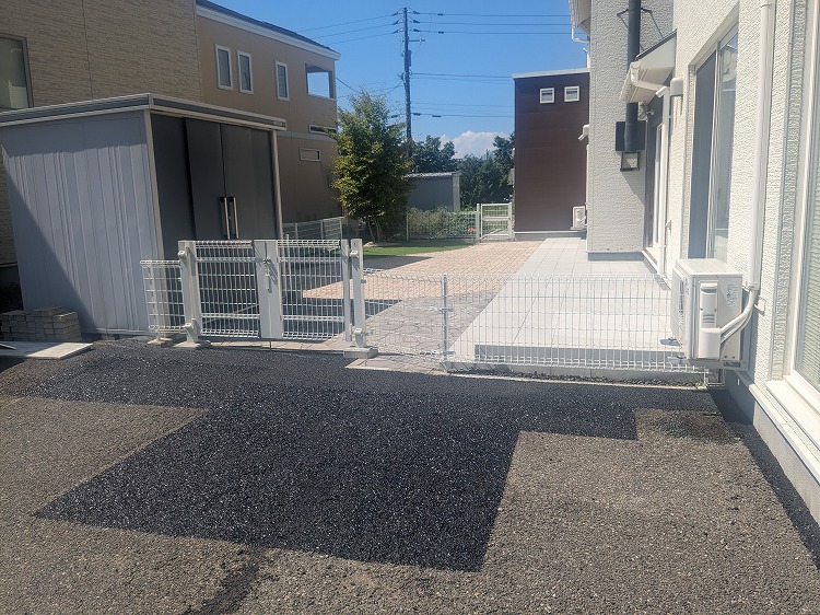 既存植栽撤去 民地石布設 人工芝 インターロッキング敷設 フェンス設置 防草シート+洗い砂利 アスファルト補修